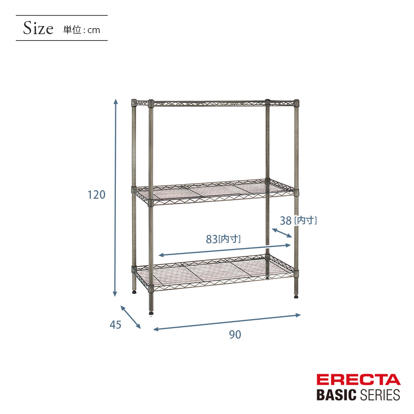 | 商品名 | エレクター ベーシックシリーズ ヴィンテージエディション ワイヤーシェルフ 幅90x奥行45x高さ120cm 3段 B1836VSS48PVS3 |
