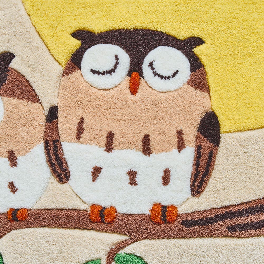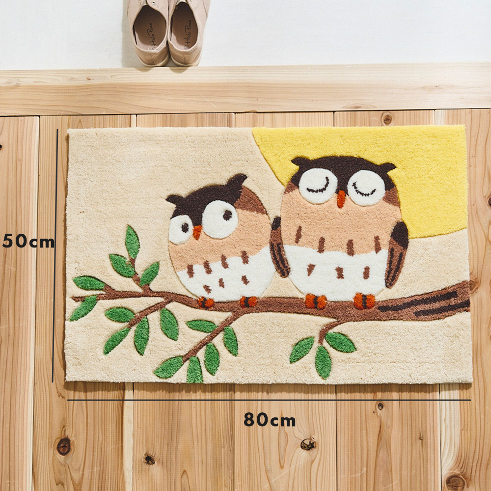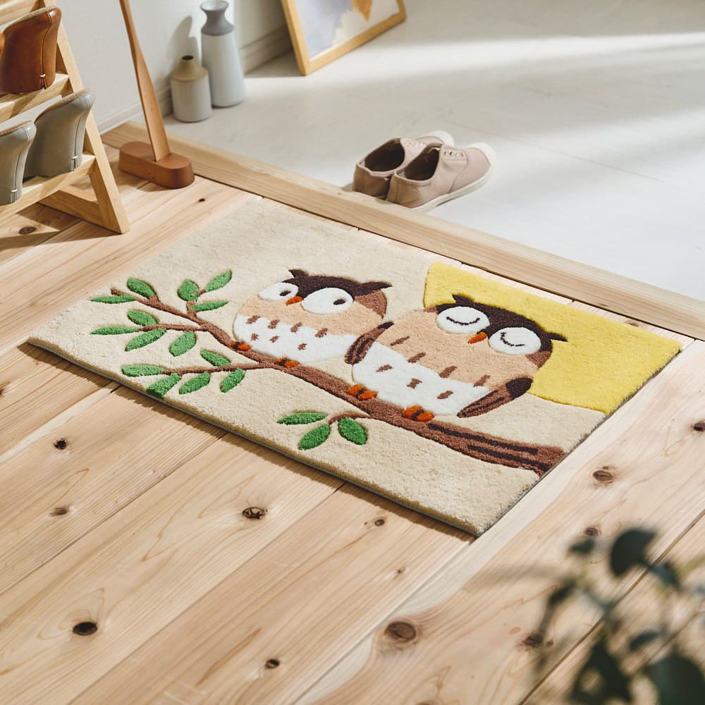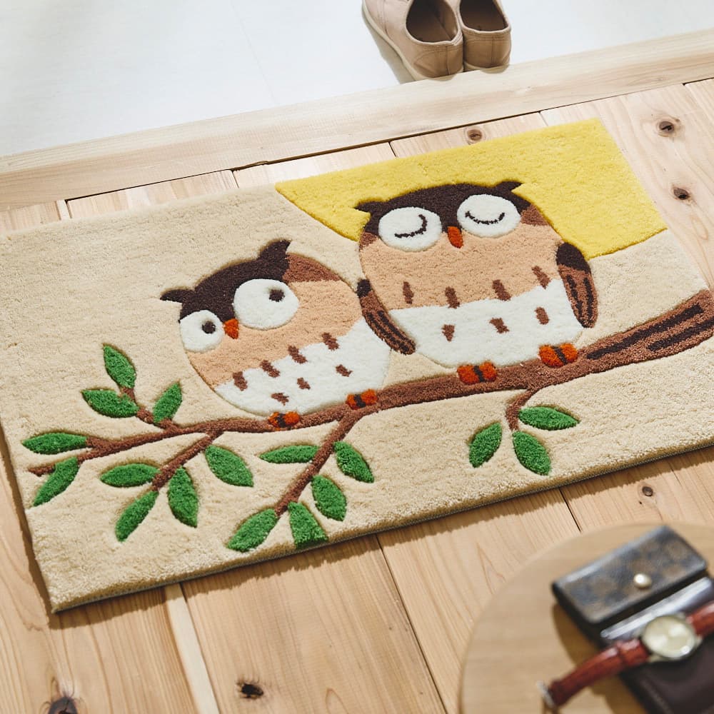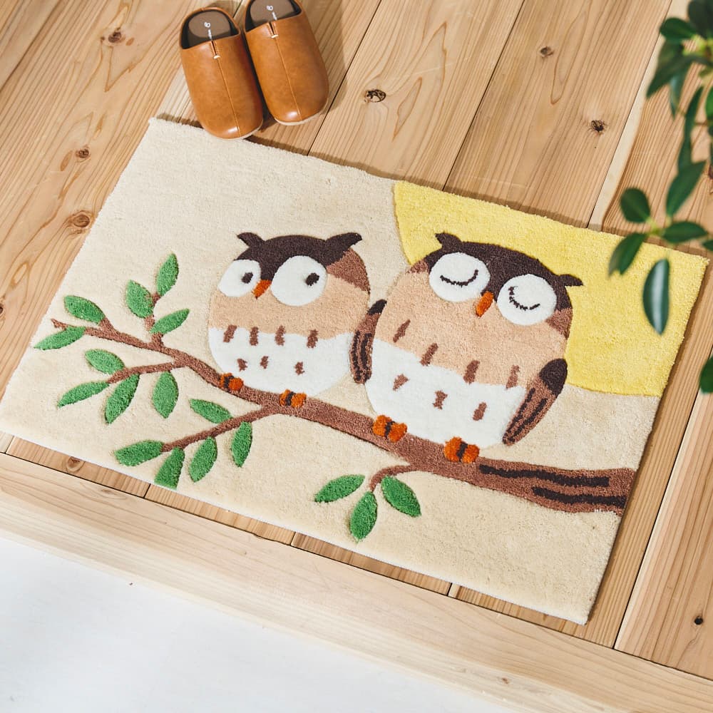 枝の上で肩を寄せ合うフクロウが、とってもキュート。おうちに帰ってくるのが楽しみになる、ほっこり癒される玄関マットです。
