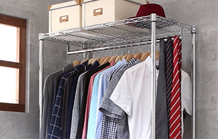 靴下やネクタイ収納など、自分の最も使いやすい形のワードローブが簡単に完成!【使用パーツ (例) 】①ハンガーポール ②延長ポール ③ワイヤーバー ④スライドバスケット ⑤リバーシブルウッドシート ⑥ワイヤーシェルフ ⑦ポール ⑧リバーシブルウッドシート ⑨ソリッドシェルフ ⑩ナイロンキャスター