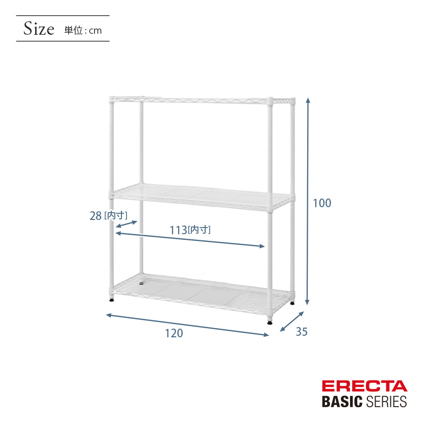 | 商品シリーズ | ベーシックシリーズ エレクター ベーシック フリーラック ホワイト 幅120×奥行35×高さ100cm 3段 RBR4814403W パーツ |