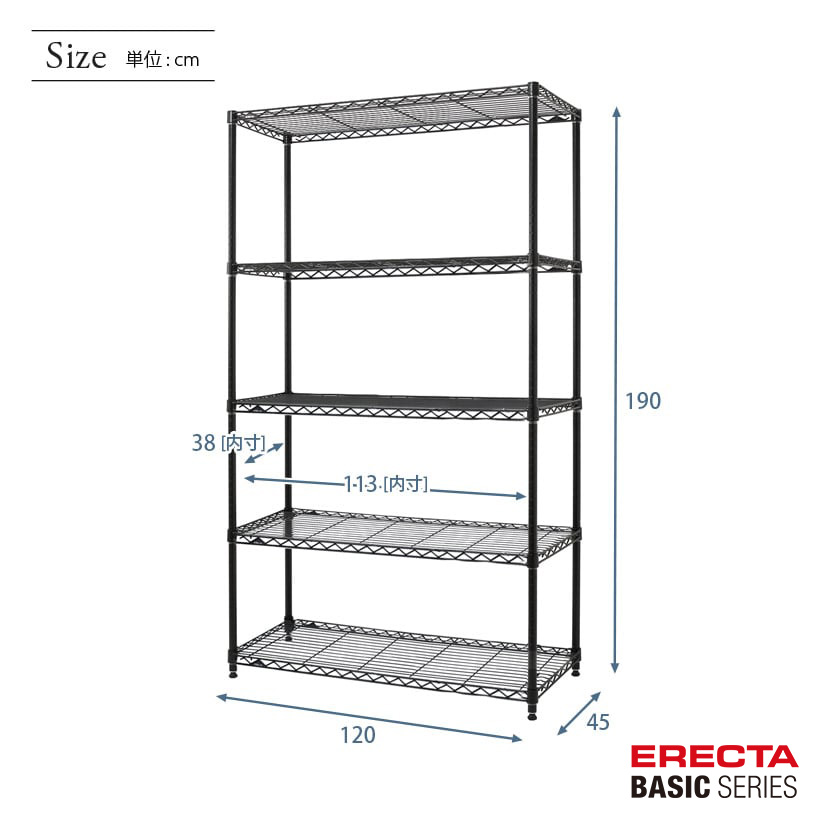 トップ > ERECTA(エレクター) > エレクターベーシックシリーズ > 予約販売(2月下旬出荷予定) ベーシックシリーズ エレクター ベーシック フリーラック ブラック 幅120×奥行45×高さ190cm 5段 RBR4818745B