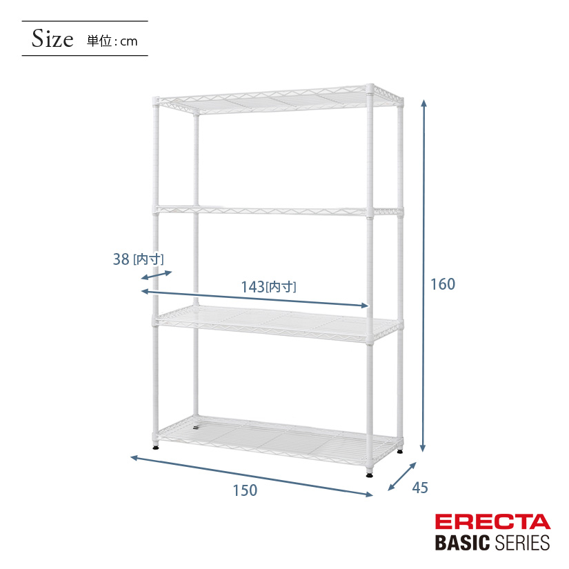 | 商品名 | ベーシックシリーズ エレクター ベーシック フリーラック ホワイト 幅150×奥行45×高さ160cm 4段 RBR6018634W |